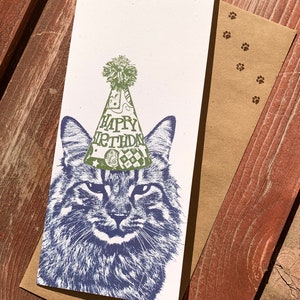 The card measures 7x5 inches (A7 size). Chubby Kitty image prints front and back. Envelope is bright lime green with little paw prints on the front. Both card and envelope are made with recycled paper.